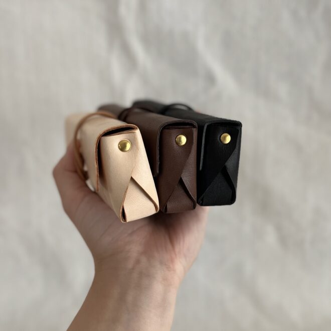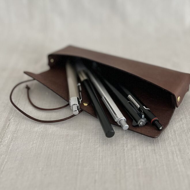 留め具にギボシも素敵だけど、留めるという役割を果たすには弱いし…ふわっとしたラインのペンケースも魅力的だけど、なんとなく印象に残らない気がする…(気がするだけかもしれない)