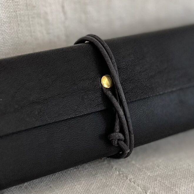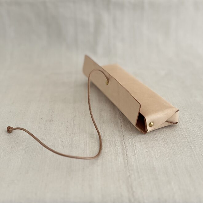 レザーペンケースの留め具といえばホック(ボタン)やファスナーなどが代表的ですが、このペンケースでは巻き紐タイプを採用しました。