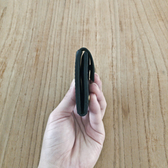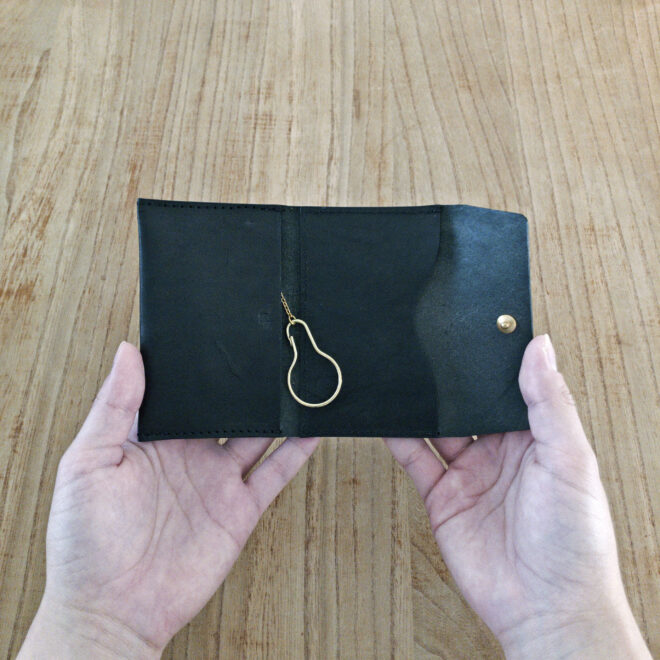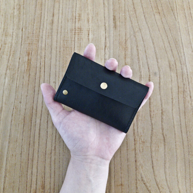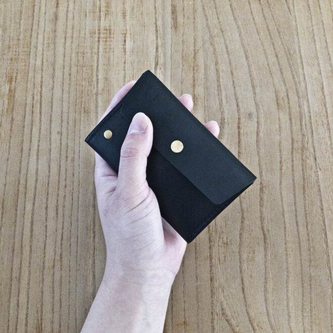 ポケットにすっと収まるように、スマートキーに対応するために付けているマチをなくしてお作りしました。