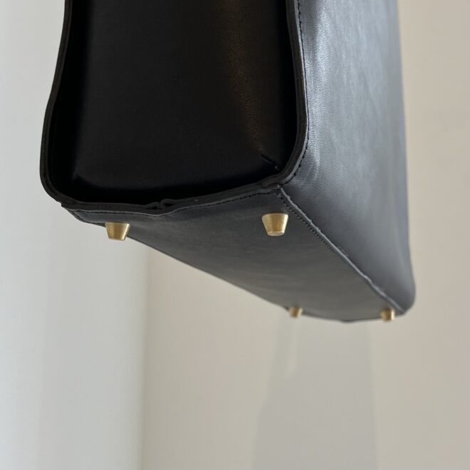 通常、レザーバッグには入れ口の内側にぐるっと一周見付(みつけ)という帯革をあてるのですが、このバッグではそれをなくしてステッチのないすっきりとした印象に。