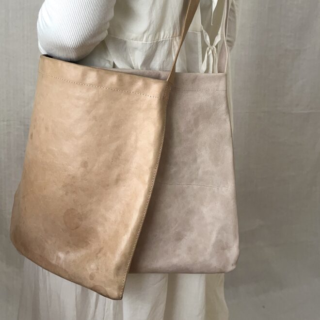 加工前のレザーはさらりとマットでハリのある質感ですが、ハンドバッグは分かりやすく艶が出て、手触りも少ししっとり柔らかくなっています。