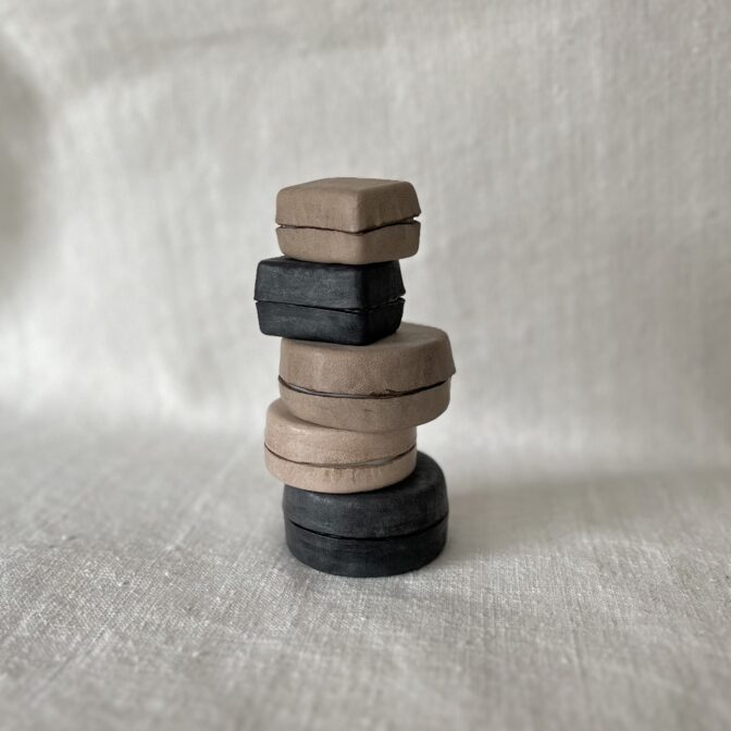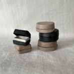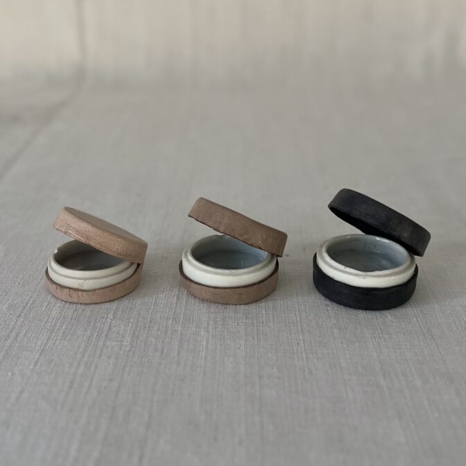 クリームポットやタイルだったと思われますが、実際の用途は不明のアンティークの陶製パーツに合わせて、受けと蓋を革で仕立てています。そのため細かいサイズはバラバラ。