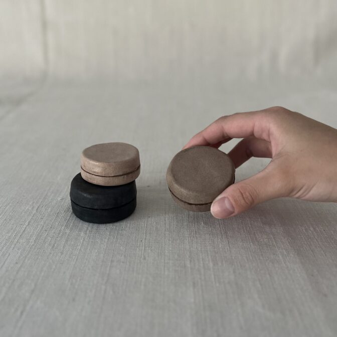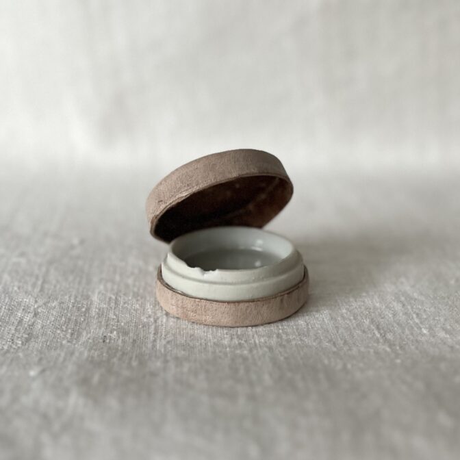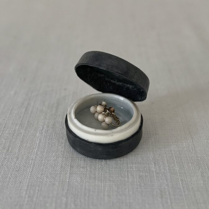 縫製を施したのは受けと蓋を繋ぐ部分だけなので余計なディテールがなく、つるっとした見た目です。砂糖菓子のような可愛らしさで、なんだか心惹かれる存在感。