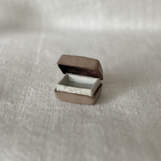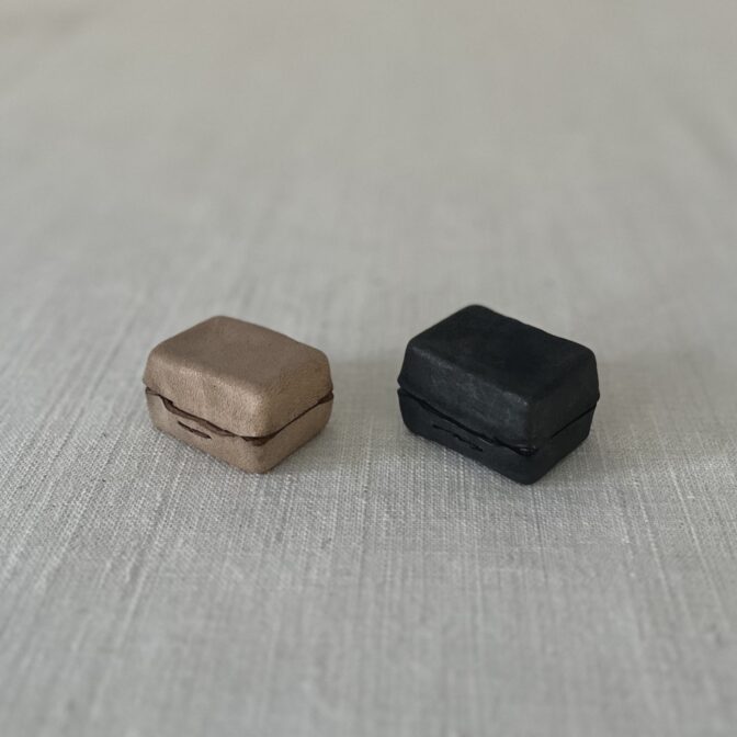 縫製を施したのは受けと蓋を繋ぐ部分だけなので余計なディテールがなく、つるっとした見た目です。砂糖菓子のような可愛らしさで、なんだか心惹かれる存在感。
