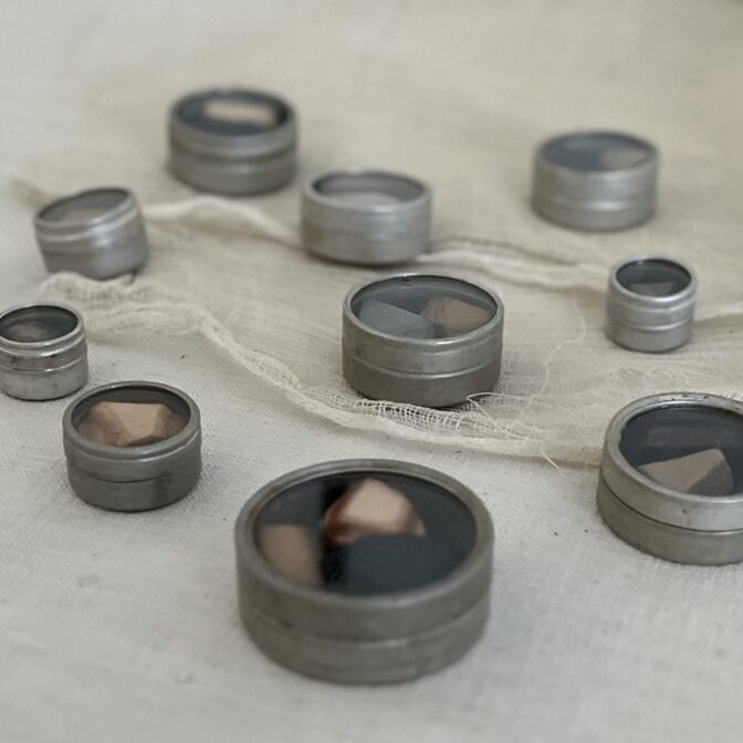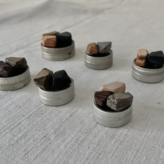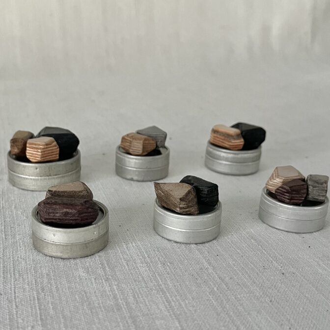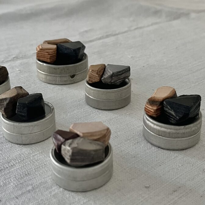時を経てきた古いものとこれから経年による表情変化を魅せる革、この概念の組み合わせの妙を見出して作ったのが「革の石 標本」です。まだ若くさらっとした革の質感が、古もののように朽ちていく過程がたのしみな作品。