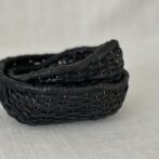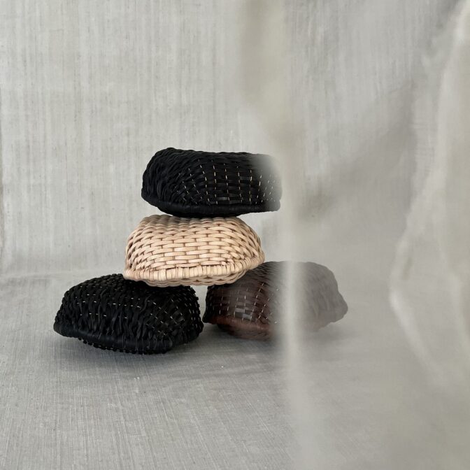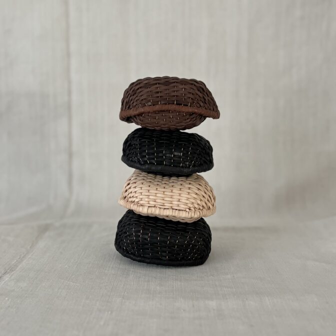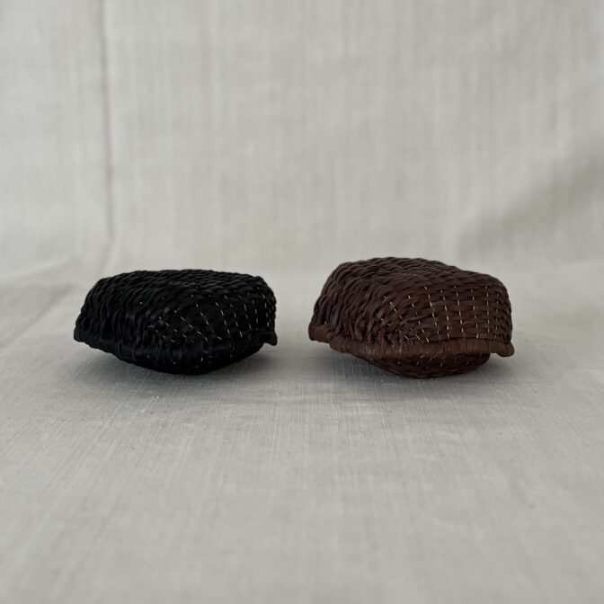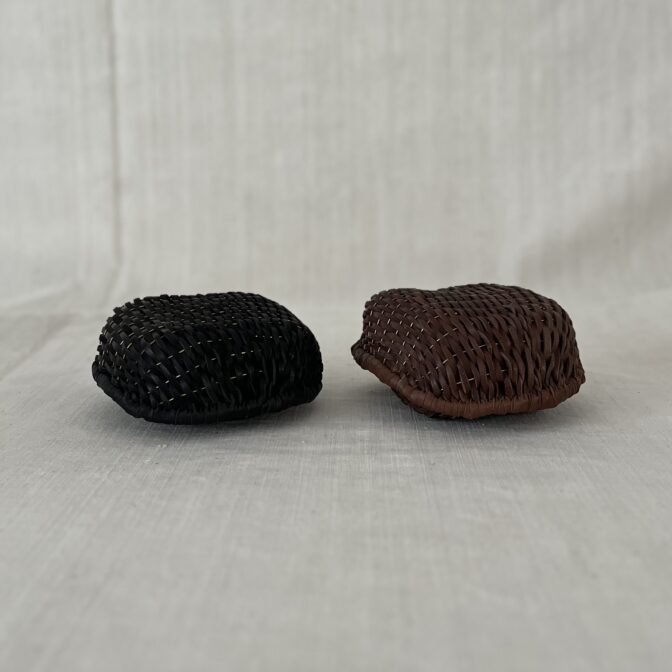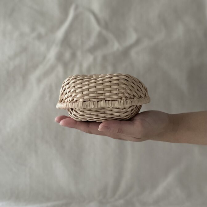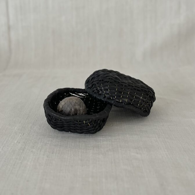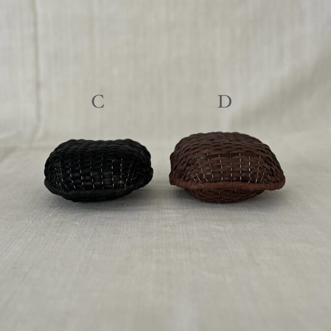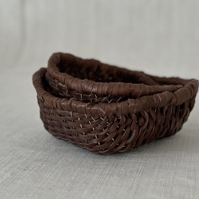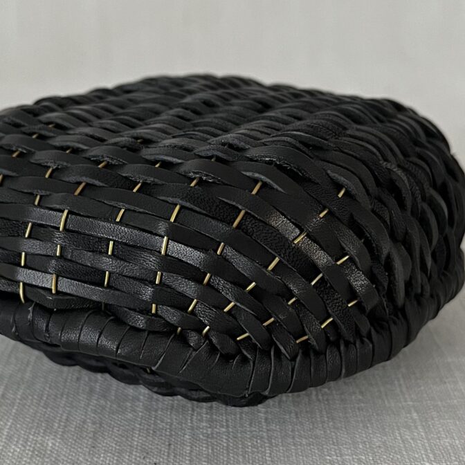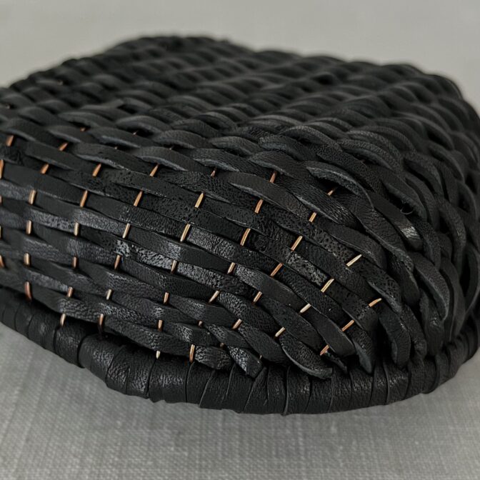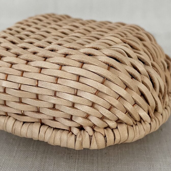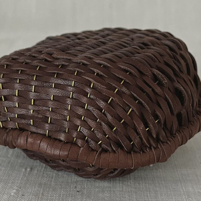 細く割いた革と金属線を編み込み、箱型に形成しながら仕立てた革編みの飯行李。