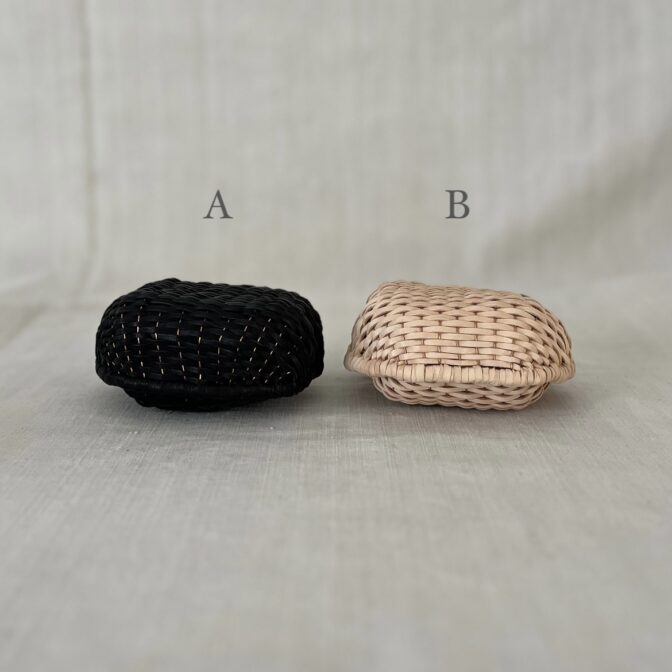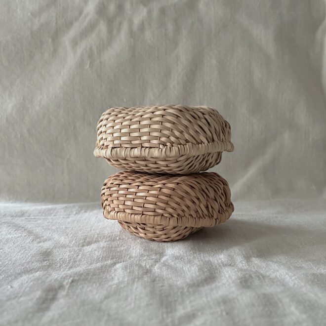 下の写真はともにキナリの革で、上が編みたての飯行李、下が少し色変化した飯行李です。