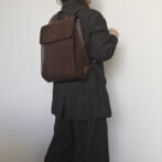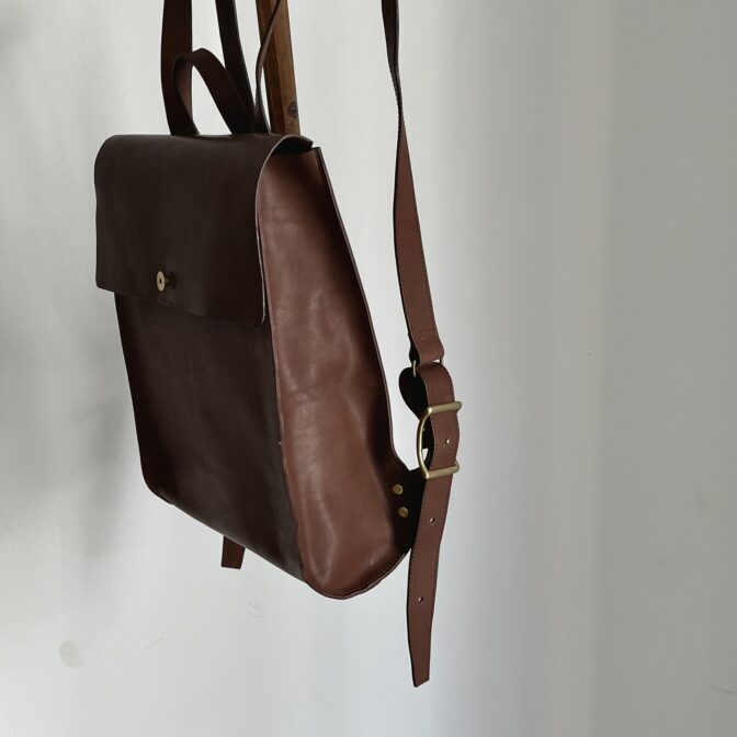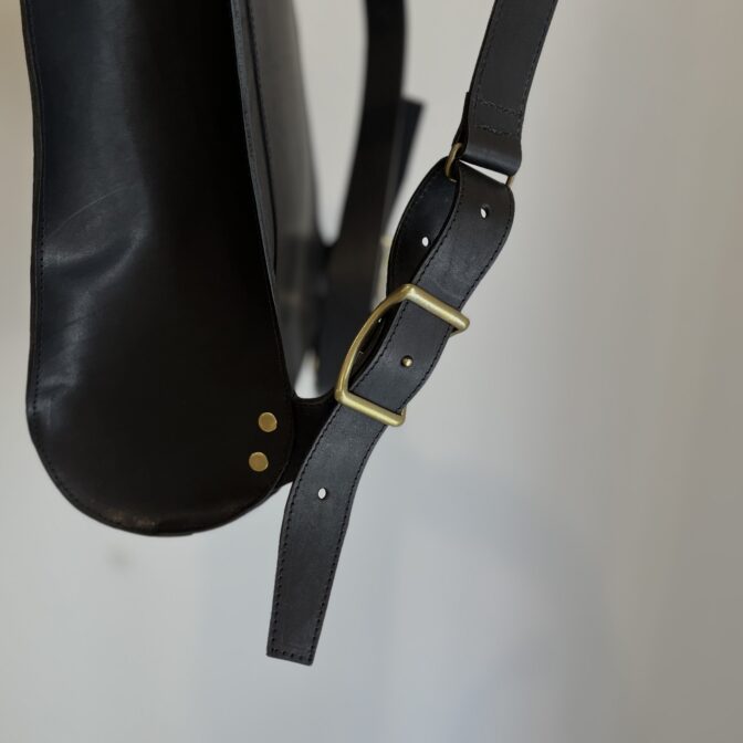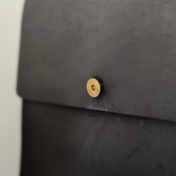 マグネット式のフラップ留めのツマミには、革製品としてはこれまた珍しい真鍮削り出しのドーナツボタン。この鞄のチャームポイントになっています。
