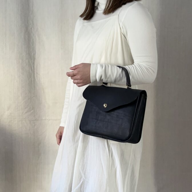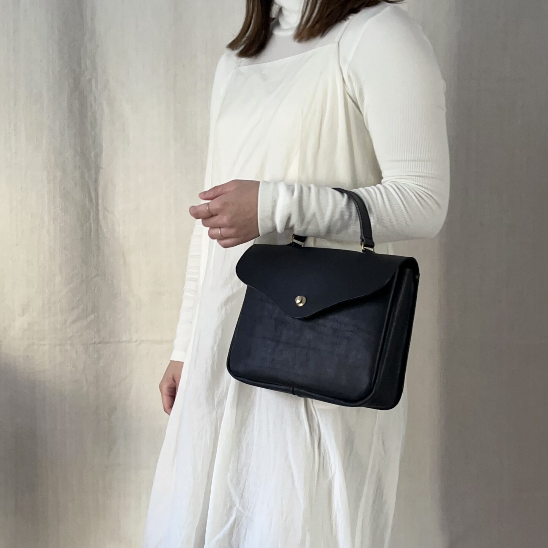 かっちりしたフォルムながらフラップの曲線と決めすぎない作りが、セミフォーマルにも普段使いにも使える万能なハンドバッグ。
