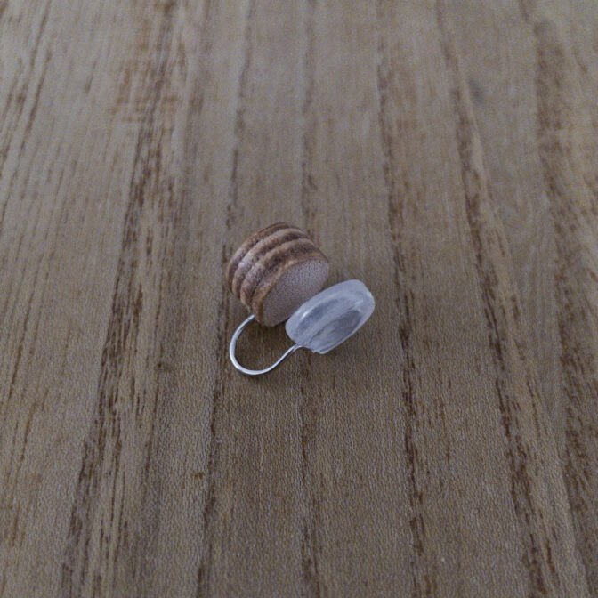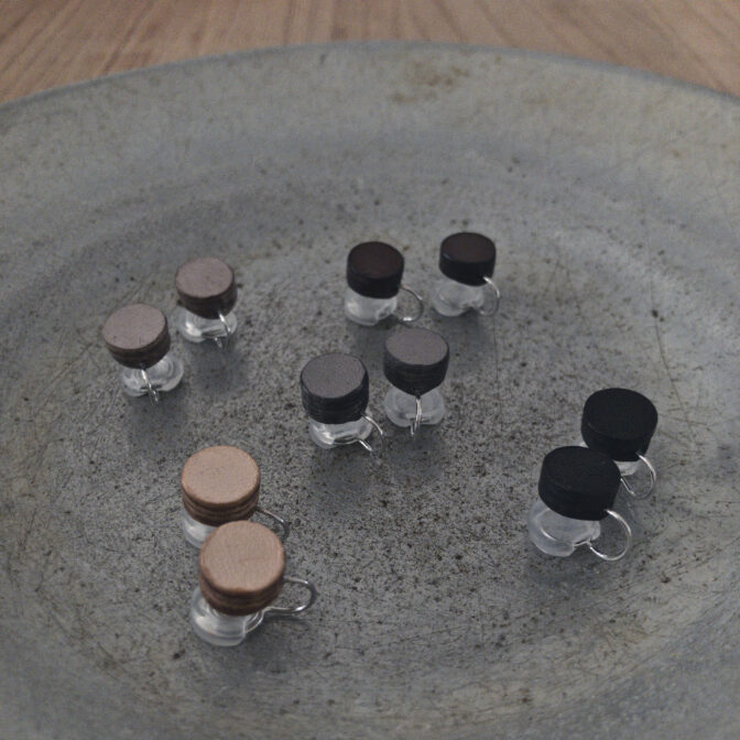 革製品の製作過程でできた端革を滴のようにぽつりと切り出し、何層にも重ねて成形。