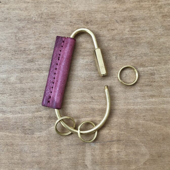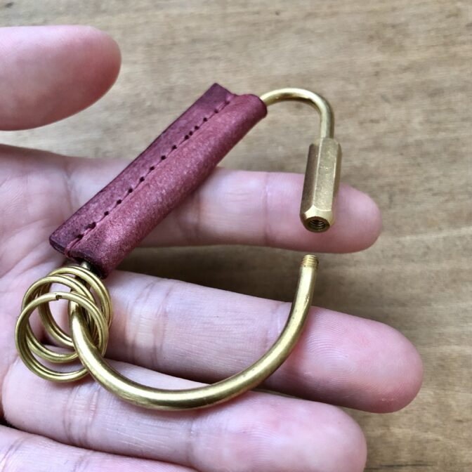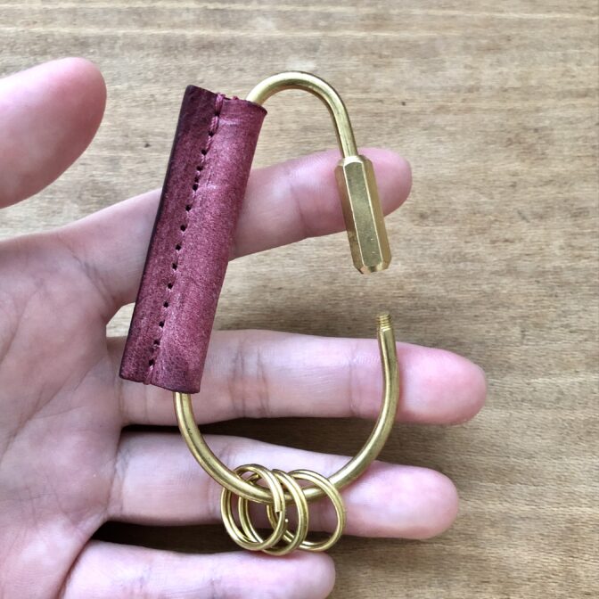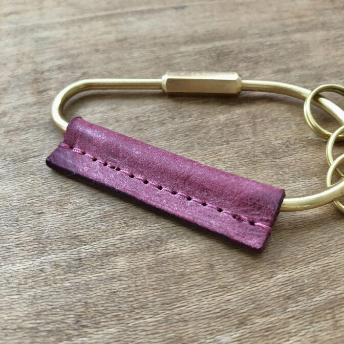 実はこの革タグは実用面での役割も果たしており、装着している鍵が涙型の真鍮リングを一周してばらついてしまうのを防ぐストッパーにもなっています。