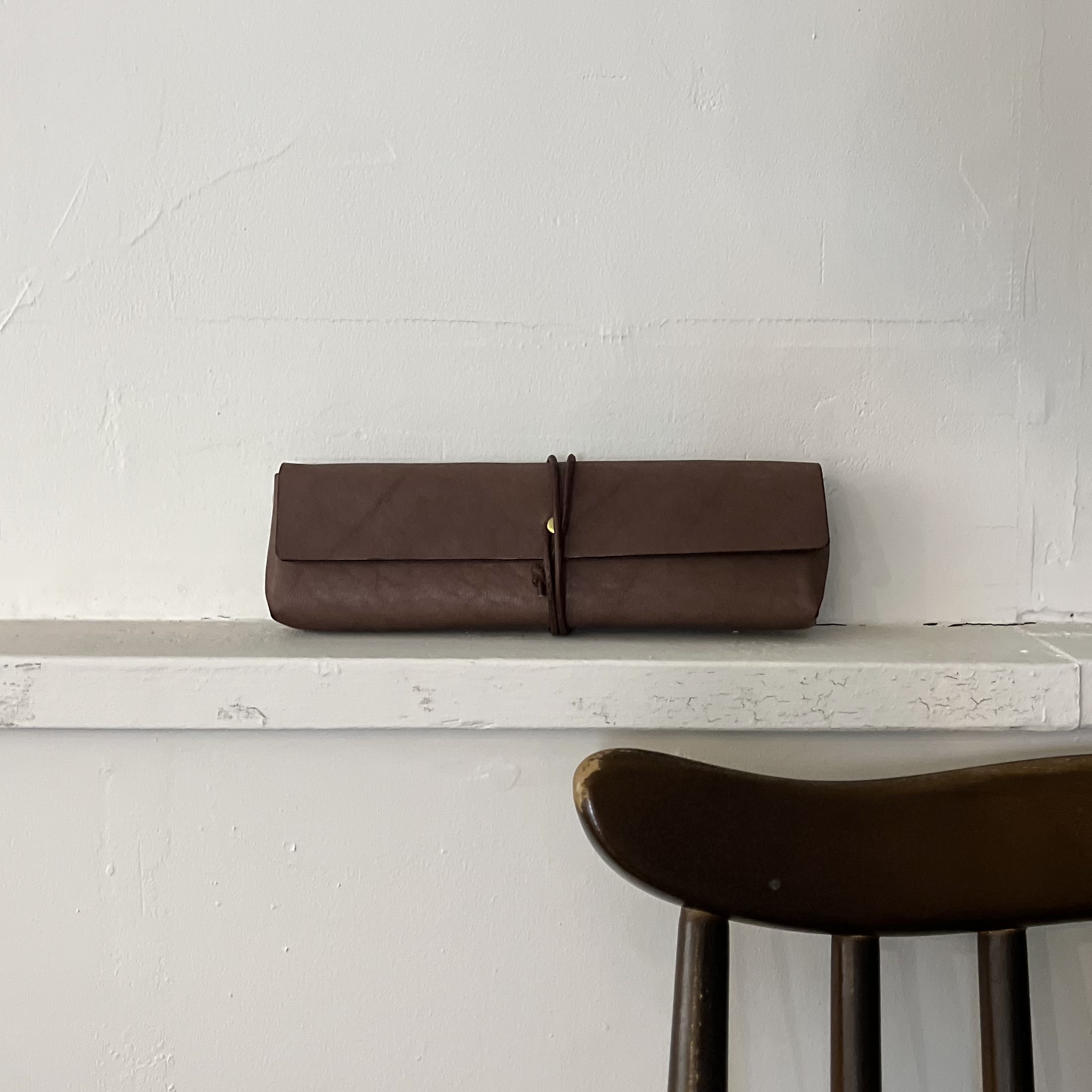 革紐も同じく真鍮のカシメで留めつけ、巻いた革紐の隙間からきらりと柔らかく光るアクセントに。