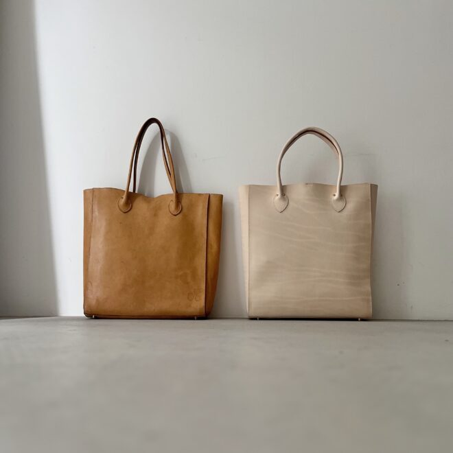 同じ革を使用した「plain tote bag」のキナリの経年変化サンプルをご用意しました。