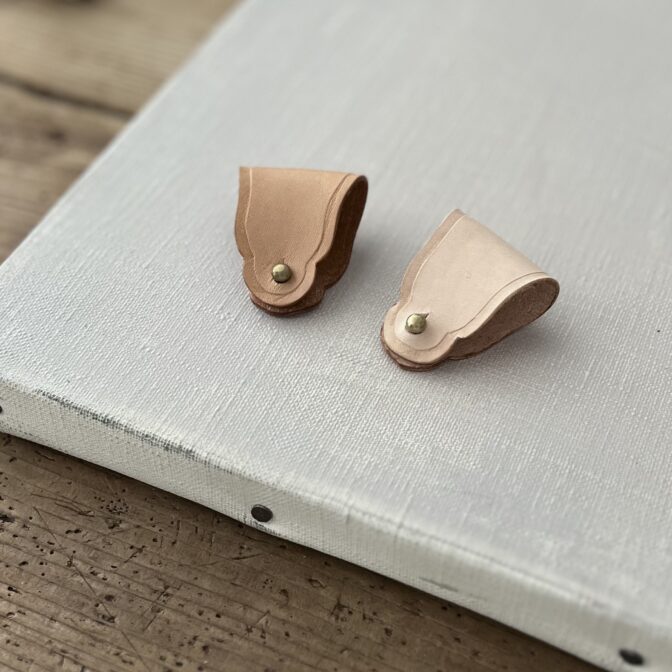 縁は押しネンという革道具で装飾を施し、プレートのリムを再現しました。