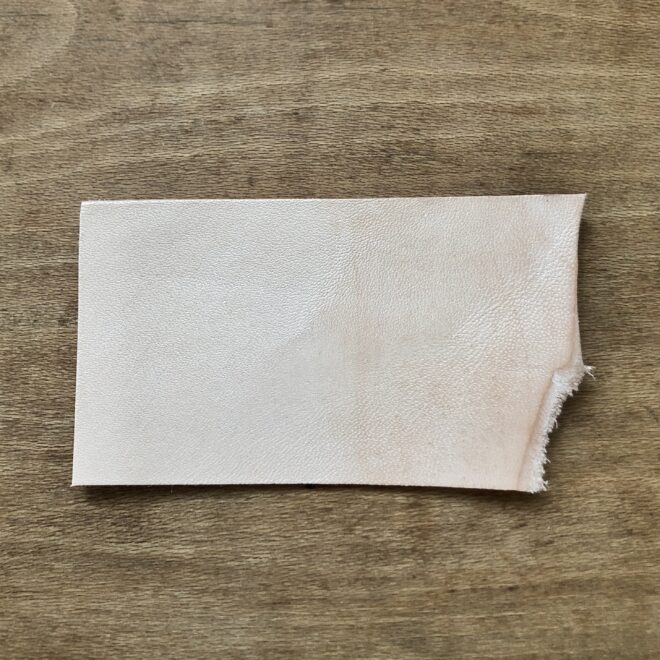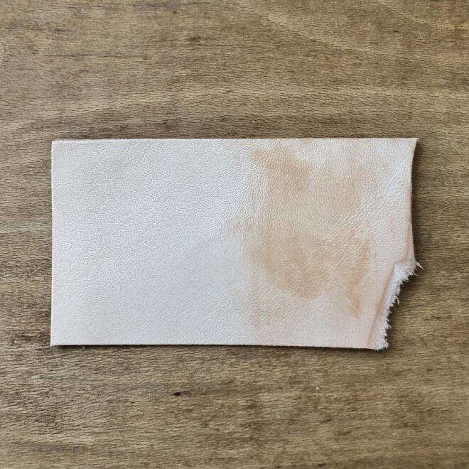 その辺にあった定番サドルレザー「キナリ」の端革に、ティッシュに染み込ませたアルコール消毒液を塗り込んでみました。