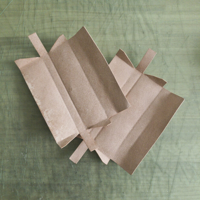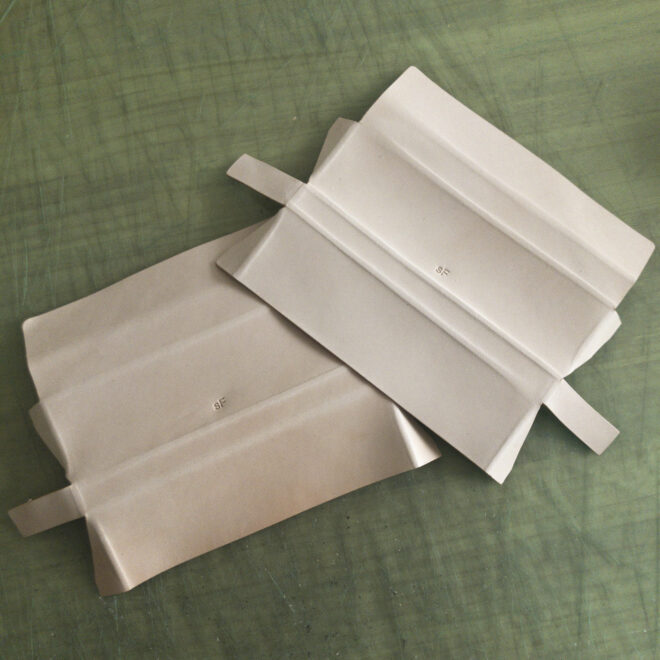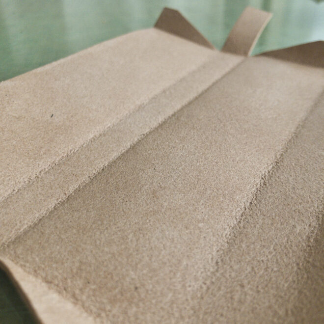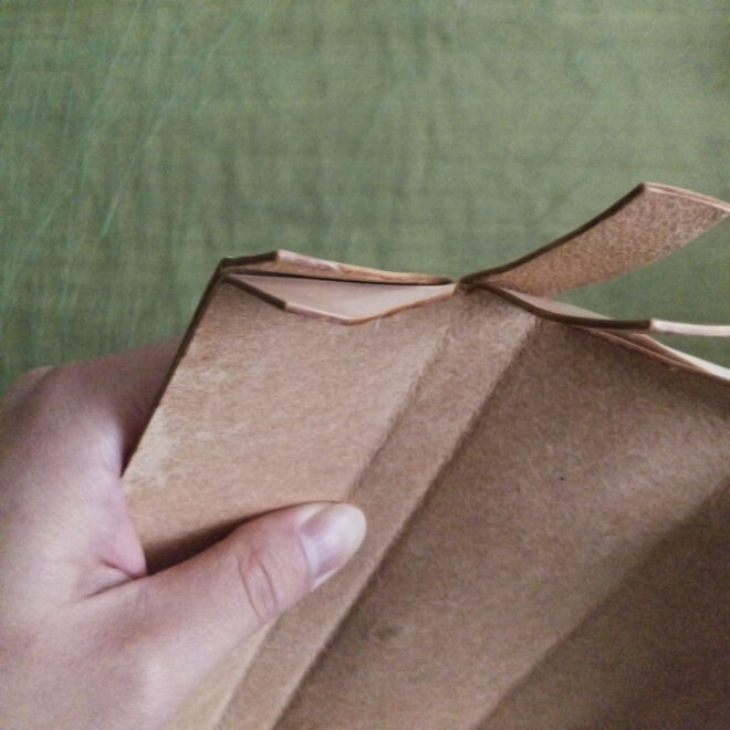 裁断が済んだら続いて床(革の裏面)を磨き、ボックス型に仕立てるために折り目を入れます。