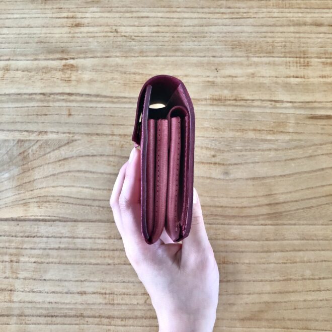 バーガンディカラーがお好きだとお聞きしたので、革質等を考慮しつつお財布に合う革をご提案しました。