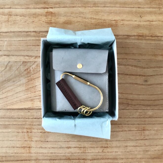 二つ折り財布専用BOXには、こんな形でキーリングを同梱してお届けさせていただきました。