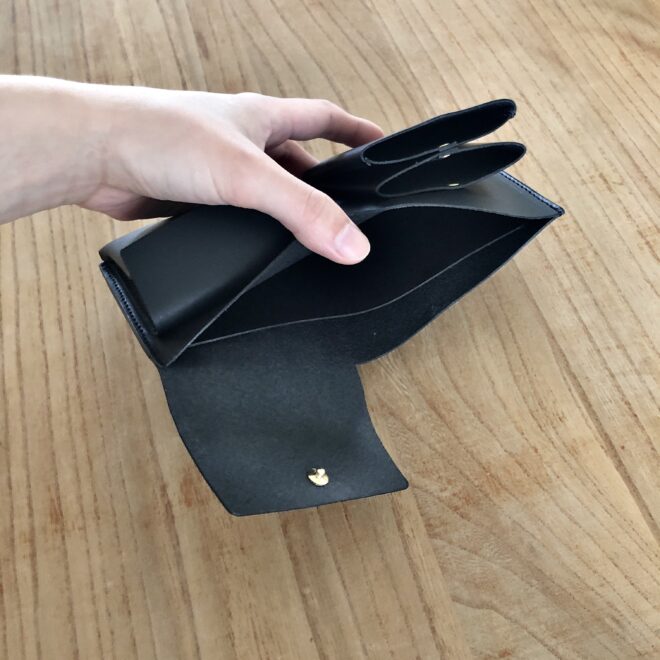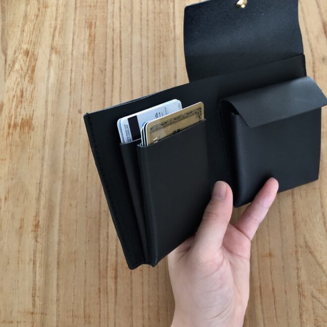 またカードポケットは通常コインポケットと同じ幅で左右対称になるよう、すっきりとした見た目のバランスを重視していますが、今回はカードをぴったりサイズのポケットに収めたいというご要望で、いつもより幅狭なカードポケットに仕上げました。