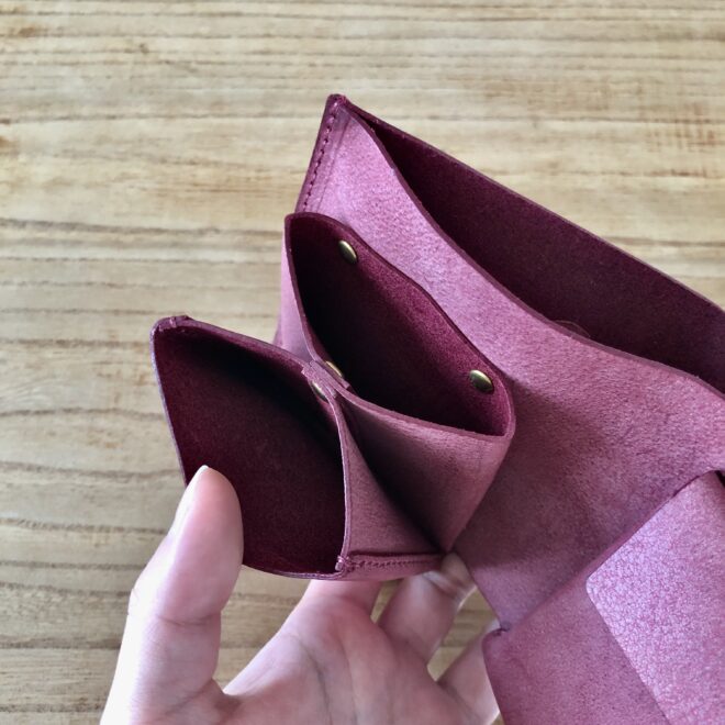 2点留めにしたカードポケットは、ご依頼主様が初回で購入された二つ折り財布で、少し開きが大きすぎるように感じられたということで、このような形に変更しました。