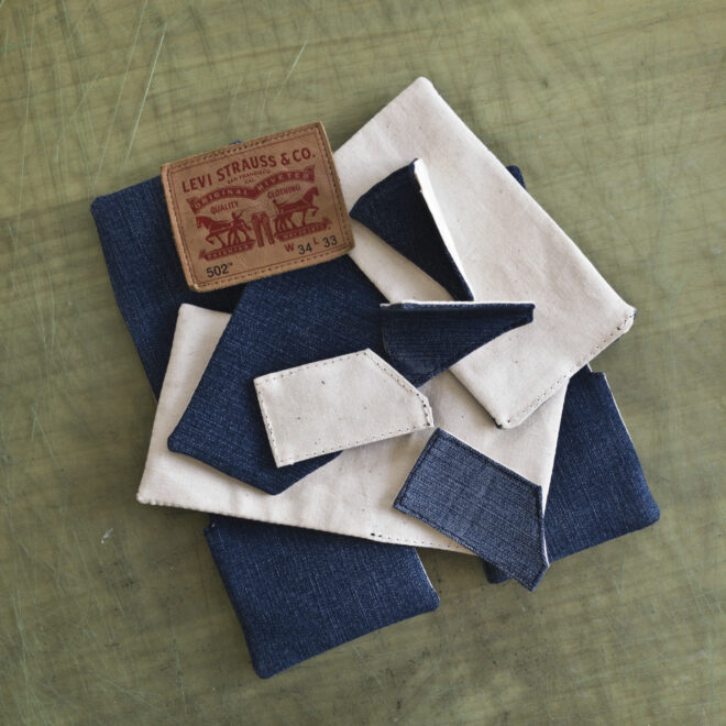当店で普段お受けしているオーダーの中でも特に変わった内容で、お客さま持ち込みのヴィンテージデニムでリメイクの二つ折り財布を作るというもの。