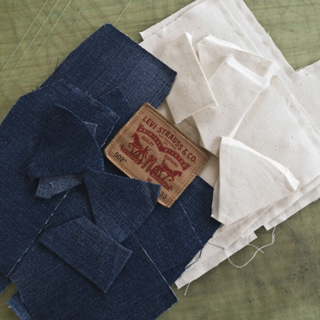 左が裁断したデニム生地、右は事前の相談で決めていただいた、裏地となる生成りのコットン生地です。
