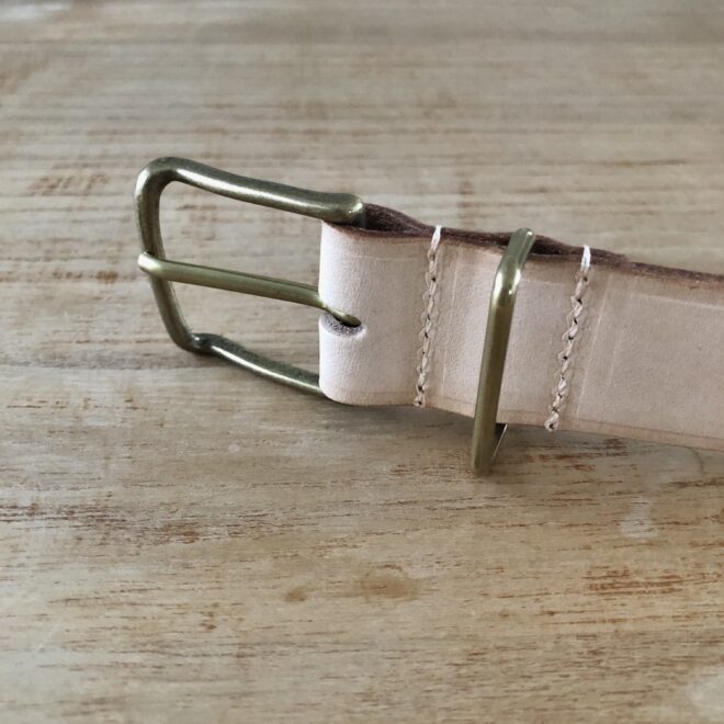特にループはベルト革と同じ革素材で作ることも多いのですが、ここではバックルとリンクしたデザインにするために真鍮製の角カンを採用。