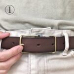 - よく使うベルトでウエストに1番フィットする穴を確認します(画像の場合は剣先側から数えて4つ目)