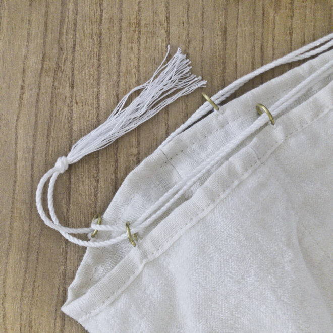 持ち手にもなる絞り紐はコットン100%のツイストコードで、品の良さとナチュラルさを感じられるいい塩梅です。