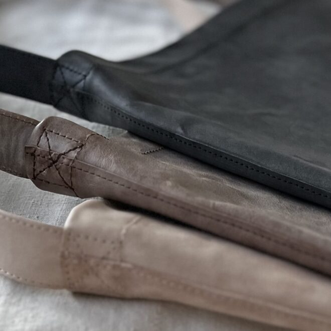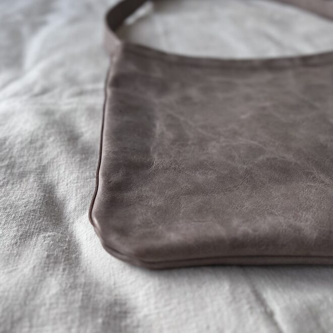 flat one shoulder bagではラフな佇まいを演出するために金具は一切使用せず、この「SIBILLA/シビラ」の革のみで仕上げました。より革の良さを感じられる仕立てになっています。
